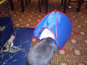 Poopy wasn’t too thrilled with his tent though. He played with it for just a little while. I think he finds his tent too small for him or he just wants to cuddle more when he’s on the bed with us. Either way, cuddly PoopyBuhda and feisty NinNin are both very hoppy today.